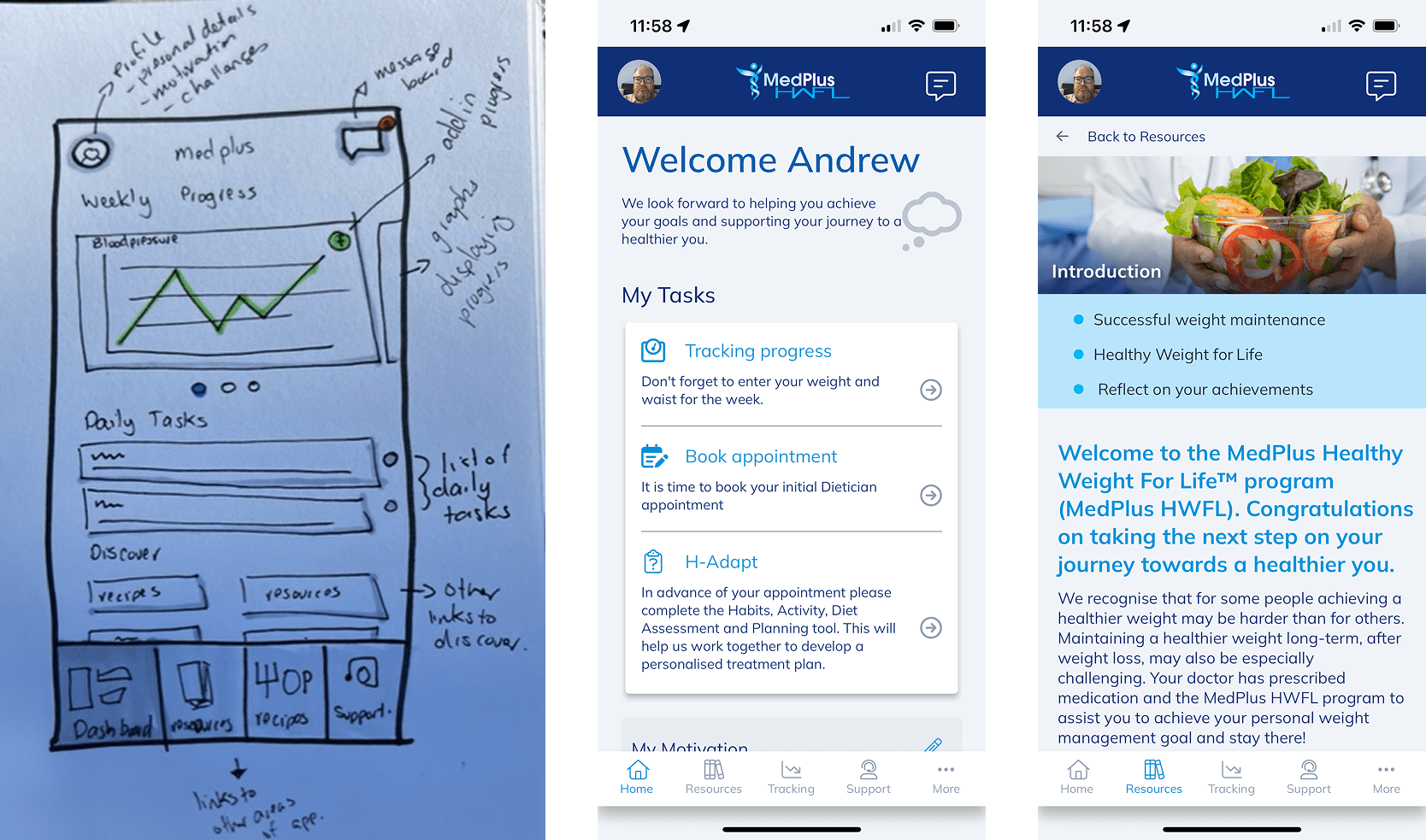 MedPlus HWFL is a prescribed weight management program that pairs medication with a care team. Before this project, patients were handed paper forms and left to stitch together their own tracking across notebooks, spreadsheets and random apps. The goal was to replace that fragmentation with a single mobile app — one place to track progress, see their plan, and stay connected to their healthcare team.